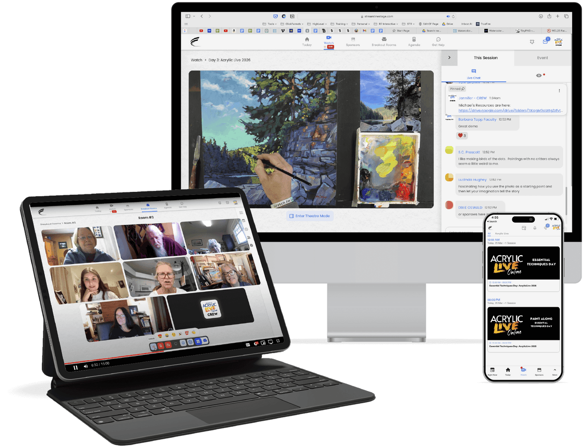 Acrylic Live is produced by the team behind PleinAir Live, Watercolor Live, Realism Live, Gouache Live, and Pastel Live. You’ll experience high-quality live production, real-time interaction with artists, and a format designed to keep you engaged—not just watching.